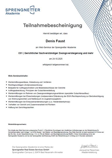 ✔ Sachverständiger für die Markt- und Beleihungswertermittlung von Immobilien – SPRENGNETTER Akademie (Reg.-Nr. S 2305-38)