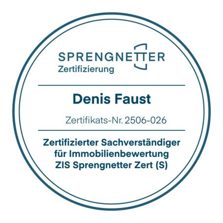Mit Erteilung der Zertifizierungsstufe Sprengnetter Zert (S) bin ich gem. ISO/IEC 17024 zertifizierter Sachverständiger für Immobilienbewertung und damit von einer DAkkS akkreditierten Zertifizierungsstelle zertifiziert.